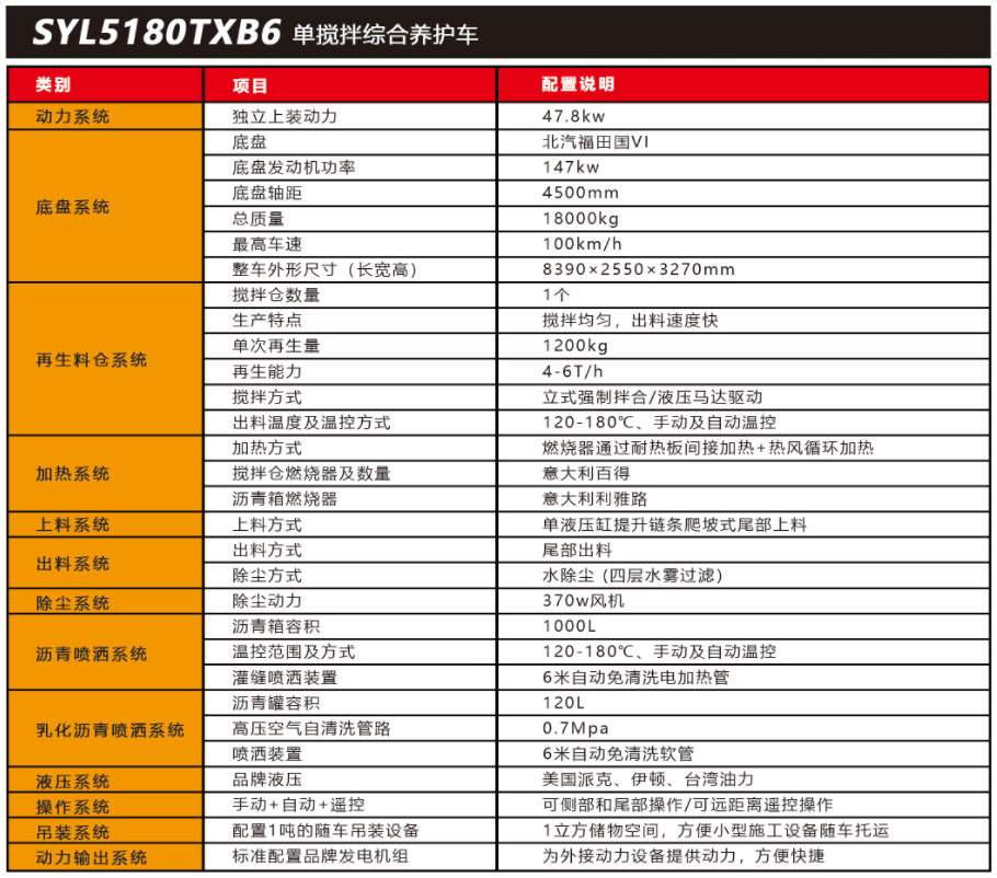 SYL5180TXB6 單攪拌綜合養(yǎng)護(hù)車是一款集現(xiàn)場生產(chǎn)新瀝青混合料、瀝青路面冷料、 舊料、銑刨料 100%現(xiàn)場加熱再生利用 ,熱瀝青灑布、裂紋跟蹤灌縫、乳化瀝青噴灑、為 其他裝置提供電力和液壓動力等多種功能于一體的瀝青路面熱再生綜合養(yǎng)護(hù)車。可實(shí)現(xiàn)多 場合、多路面的各種類養(yǎng)護(hù)作業(yè) ,養(yǎng)護(hù)修補(bǔ)費(fèi)用低 ,作業(yè)快捷 ,高效率、節(jié)能環(huán)保性能突 出等特點(diǎn)。適用于遠(yuǎn)郊較寬闊區(qū)域中小施工量和高速公路的修補(bǔ)施工。