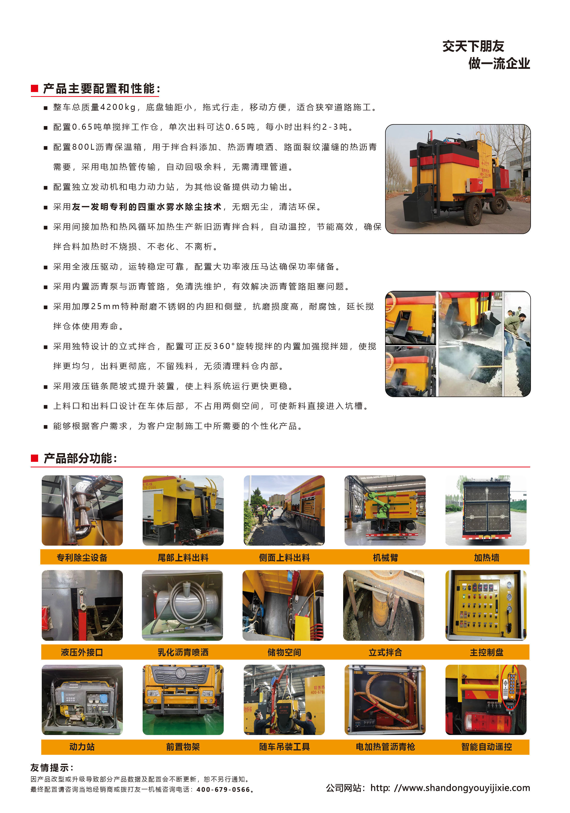 山東友一機(jī)械設(shè)備有限公司主要生產(chǎn)路面綜合養(yǎng)護(hù)車、瀝青路面養(yǎng)護(hù)車道路養(yǎng)護(hù)車、瀝青熱再生修補(bǔ)車、瀝青灌縫機(jī),專注、專業(yè)于道路養(yǎng)護(hù)機(jī)械設(shè)備與養(yǎng)護(hù)材料的生產(chǎn)和研發(fā)。